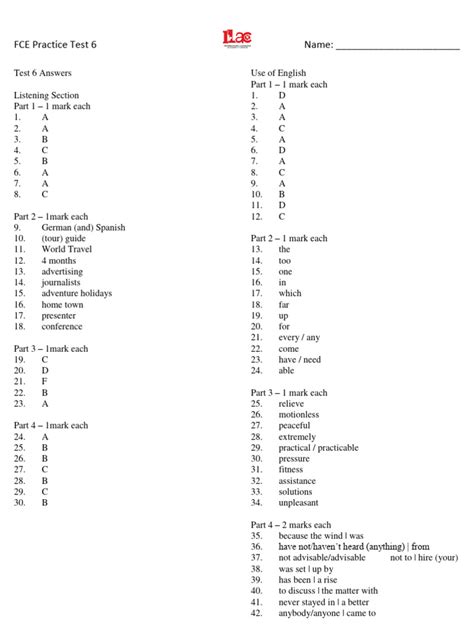 fce test 6 answer key